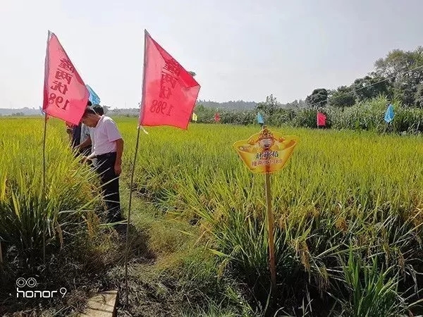 觀摩會現(xiàn)場,大家冒著酷暑,興致勃勃地在現(xiàn)場考察隆兩優(yōu)1988的表現(xiàn),在青山環(huán)抱、綠水環(huán)繞的示范田中,一排排整齊的稻穗,昂首挺胸,展示著傲人身姿,引得眾人忘記了酷暑疲勞,快速奔向田邊,認真地觀賞著隆兩優(yōu)1988,撫摸著沉甸甸的稻穗,察看著結(jié)實率、細數(shù)著分蘗數(shù),發(fā)出嘖嘖的贊嘆聲,紛紛合影留念。