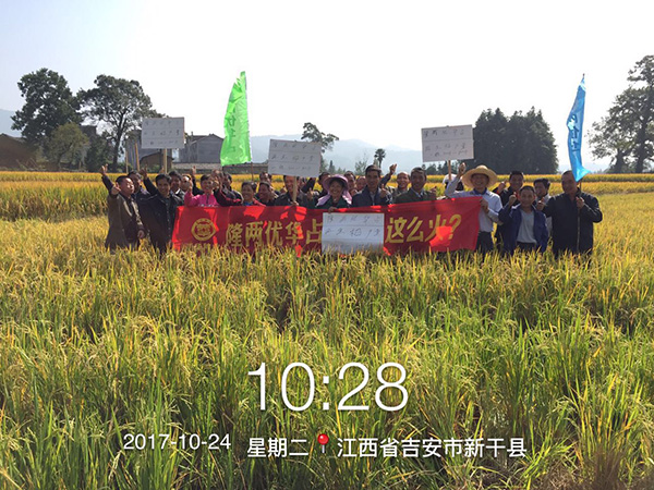 2017年10月24日,江西省新干縣召開了隆兩優(yōu)華占再生稻零售商觀摩及種植大戶預(yù)定會(huì)議,全縣各鄉(xiāng)鎮(zhèn)零售商和種植大戶等40余人前往七琴鎮(zhèn)現(xiàn)場(chǎng)觀摩。
