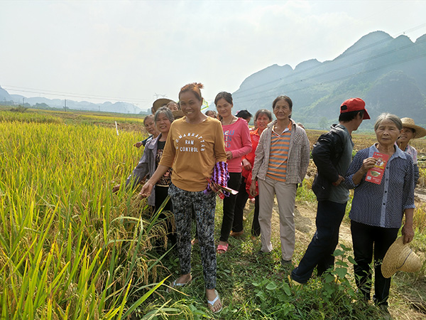 10月30日,在田東經(jīng)銷商馬紅艷的組織下來(lái)到這個(gè)美麗的新農(nóng)村,隆兩優(yōu)1988優(yōu)秀的田間表現(xiàn)吸引了全村7個(gè)小組80余種植戶參加了此次觀摩會(huì)。田間隊(duì)伍龐大,浩浩蕩蕩匯集媽?xiě)c(壯語(yǔ)稱呼)阿姨位于中心的田塊。由于人數(shù)多,各小組隊(duì)長(zhǎng)自發(fā)組織好各小組簽到,會(huì)場(chǎng)整齊有序。