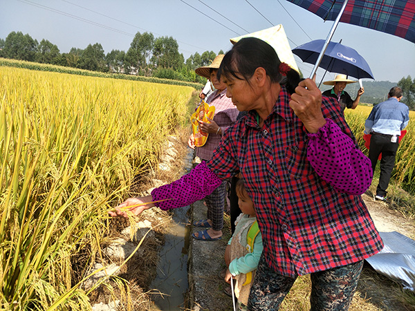 此次觀摩的位置在校椅鎮(zhèn)六蘭村,圍繞田邊種著瓜果,前后有四塊不同位置的隆兩優(yōu)1988,大家對種植水平、管理到位等問題紛紛發(fā)表意見。今年沒有種的鄉(xiāng)民都在問明年什么時候有種子賣,看著很不錯的收成,一看就穩(wěn)產(chǎn),也沒有病害。零售商對品種也表示滿意,堅定了明年的銷售信心。
