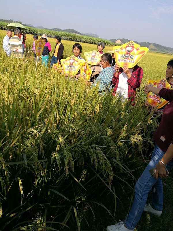 據(jù)零售商黃姐介紹,今年百合鎮(zhèn)共賣種20幾件隆兩優(yōu)1988,大盧村更是爭(zhēng)氣, 在種植水平上遠(yuǎn)超其它村落,省心省力。民風(fēng)純樸的鄉(xiāng)民們笑咪咪的折過一旁的果蔗,熱情地遞過來。接著說,今年到處有病害,但這個(gè)品種沒有格外多操心,好品種省心。大家爭(zhēng)相帶路去看隆兩優(yōu)1988的表現(xiàn),看著一片片豐收在即的稻田,喜悅的心情無以言表。