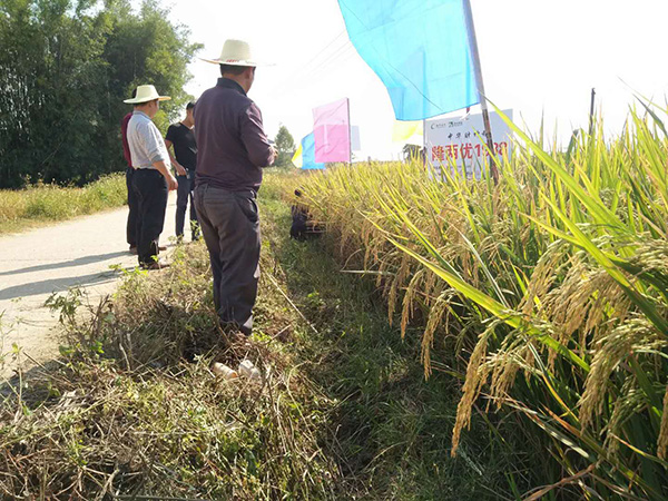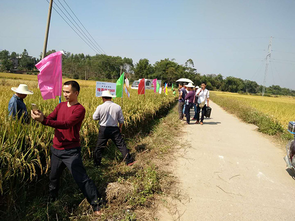 2017年11月3日早晨7點(diǎn)廣西賀州市鋪門(mén)鎮(zhèn)南華村忽然熱鬧起來(lái),原來(lái)是鋪門(mén)鎮(zhèn)隆兩優(yōu)1988經(jīng)銷(xiāo)商陳美香邀請(qǐng)了鋪門(mén)鎮(zhèn)種植大戶和水稻種植合作社的老板們前來(lái)田間觀摩財(cái)神稻,首先,代理商梁總介紹,這塊田的戶主是一對(duì)年過(guò)7旬的老人家,因老人家精力不足所以在田間管理與施肥方面相對(duì)缺乏,只靠田塊原本的肥水條件自然生長(zhǎng),但隆兩優(yōu)1988的長(zhǎng)勢(shì)和表現(xiàn)卻遠(yuǎn)遠(yuǎn)超越周邊的其它品種,這使農(nóng)戶們驚嘆不已!