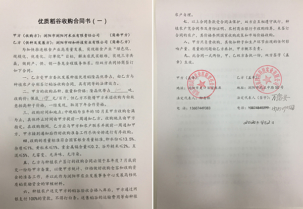 最終,隆晶優(yōu)蒂占在瀏陽市的訂單收購合同由瀏陽河米業(yè)有限責(zé)任公司與瀏陽市四和科技實業(yè)有限公司簽訂,合同約定:由四和科技發(fā)展面積種植該高檔優(yōu)質(zhì)香稻品種,所有符合質(zhì)量標(biāo)準(zhǔn)的該品種稻谷由瀏陽河米業(yè)承諾保底138元/百斤收購。該合同共約定訂單收購隆晶優(yōu)蒂占面積近3000畝。