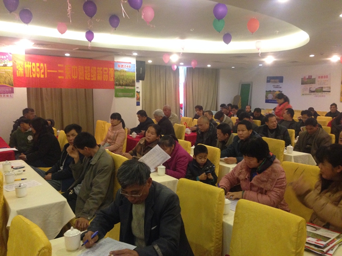 與會的亞華種子廣東分公司副總經(jīng)理曹攀峰對今年早造市場形勢進(jìn)行分析,并帶來了公司強(qiáng)勢的早造新品種——深優(yōu)9521﹙粵審稻2013038﹚。該品種為感溫型三系雜交稻組合,早造平均全生育期在懷集大約為125—128天,科高100厘米左右,株形適中,分蘗力較強(qiáng),結(jié)實(shí)率高,米質(zhì)鑒定為國標(biāo)優(yōu)質(zhì)2級和廣東省標(biāo)優(yōu)質(zhì)3級,生長清秀,后期熟色好,抗倒力強(qiáng),中抗白葉枯病??梢哉f是廣大零售商們非常歡迎的早造品種。大家聽了曹經(jīng)理的介紹,又通過視頻和照片觀看了廣東各縣深優(yōu)9521的表現(xiàn)情況,喜出望外,紛紛表示“大品牌好品種,值得信賴”,“今年早造又有好品種賣了”,“這好品種我要主推”……