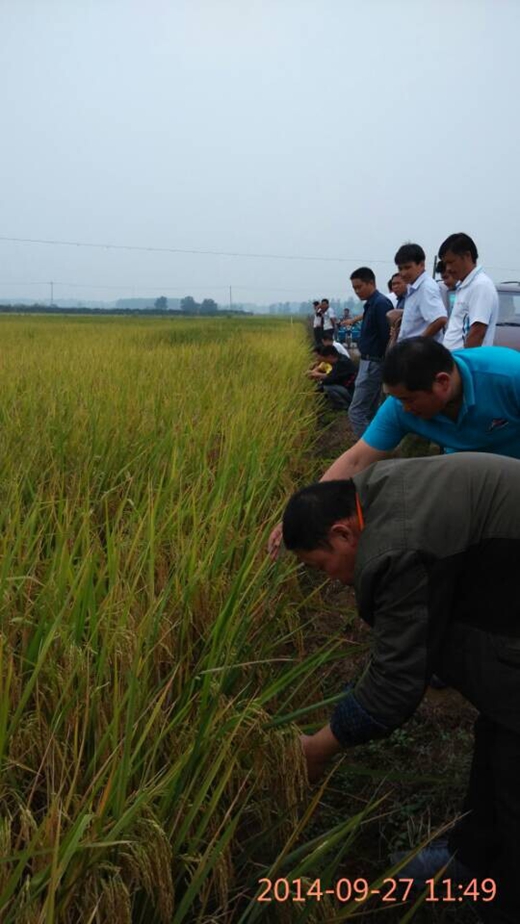 2014年9月27日,在鳳陽(yáng)縣代理商郭守福的組織下,亞華種業(yè)口糧稻深兩優(yōu)5183現(xiàn)場(chǎng)觀摩會(huì)勝召開(kāi)。參加會(huì)議的零售商有二十多人,在代理商郭守福帶領(lǐng)下,一行人看了四塊田塊。這幾塊田在不同鄉(xiāng)鎮(zhèn),由不同農(nóng)戶種植,土壤條件、肥力水平、種植技術(shù)層次不一,有熟透馬上就能收割的,有遲一點(diǎn)還在落色 變黃的,有肥力好的,有剛剛整改過(guò)肥力跟不上的,但正好從各個(gè)方面深度表現(xiàn)了深兩優(yōu)5183的田間特點(diǎn)。所有田塊均稻曲病輕微,也沒(méi)有發(fā)生流行穗頸瘟,各位零售商對(duì)此均是稱贊不已。大家下田數(shù)分蘗,看 結(jié)實(shí),檢驗(yàn)抗倒性,沒(méi)有一點(diǎn)能被挑剔的,特別是李二莊的種植戶,他一直跟著我們看了所有田塊,對(duì)5183更是非常滿意,多次當(dāng)眾表示來(lái)年要加大種植面積。此次會(huì)議的召開(kāi),給參會(huì)人員留下了深刻的好印象,紛紛表示這才是鳳陽(yáng)需要的超級(jí)稻!