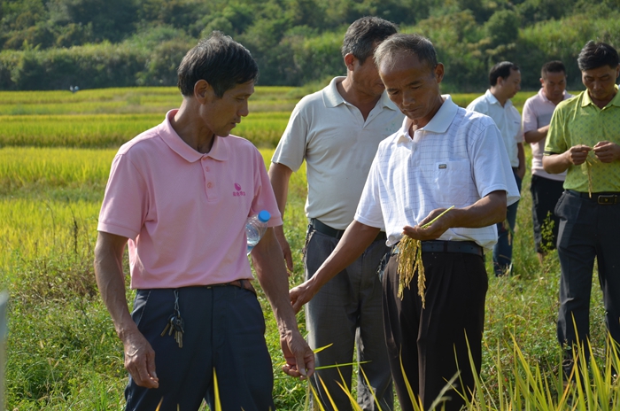 2014年9月21日下午,宜豐代理商易委才組織10名零售商驅(qū)車來到麻田村觀看了隆兩優(yōu)華占示范田。
