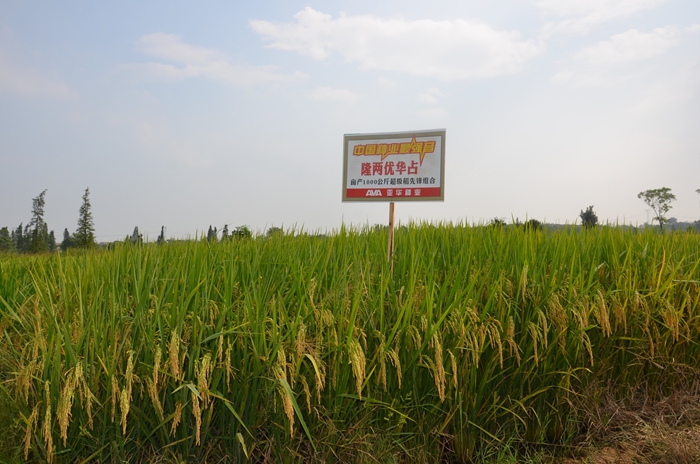 來到田間,一眼便能看見隆兩優(yōu)華占的身影,遠望過去便得到一片贊揚之聲。據(jù)悉,隆兩優(yōu)華占是袁隆平院士第四期畝產(chǎn)1000公斤超級稻攻關(guān)品種,2013年醴陵示范田間袁老師更是稱贊它為“金剛不倒,鐵桿超級稻”。現(xiàn)場經(jīng)銷商們俯身查看稻田,數(shù)分蘗,數(shù)穗粒數(shù),看的格外仔細。一位老農(nóng)機站長激動的說,這么多年來我還沒見過這么好的品種,抗倒又抗蟲,米質(zhì)還達到國家一級米,今后我會作為第一主推品種在我們那推廣種植,把好的品種帶給更多農(nóng)民。