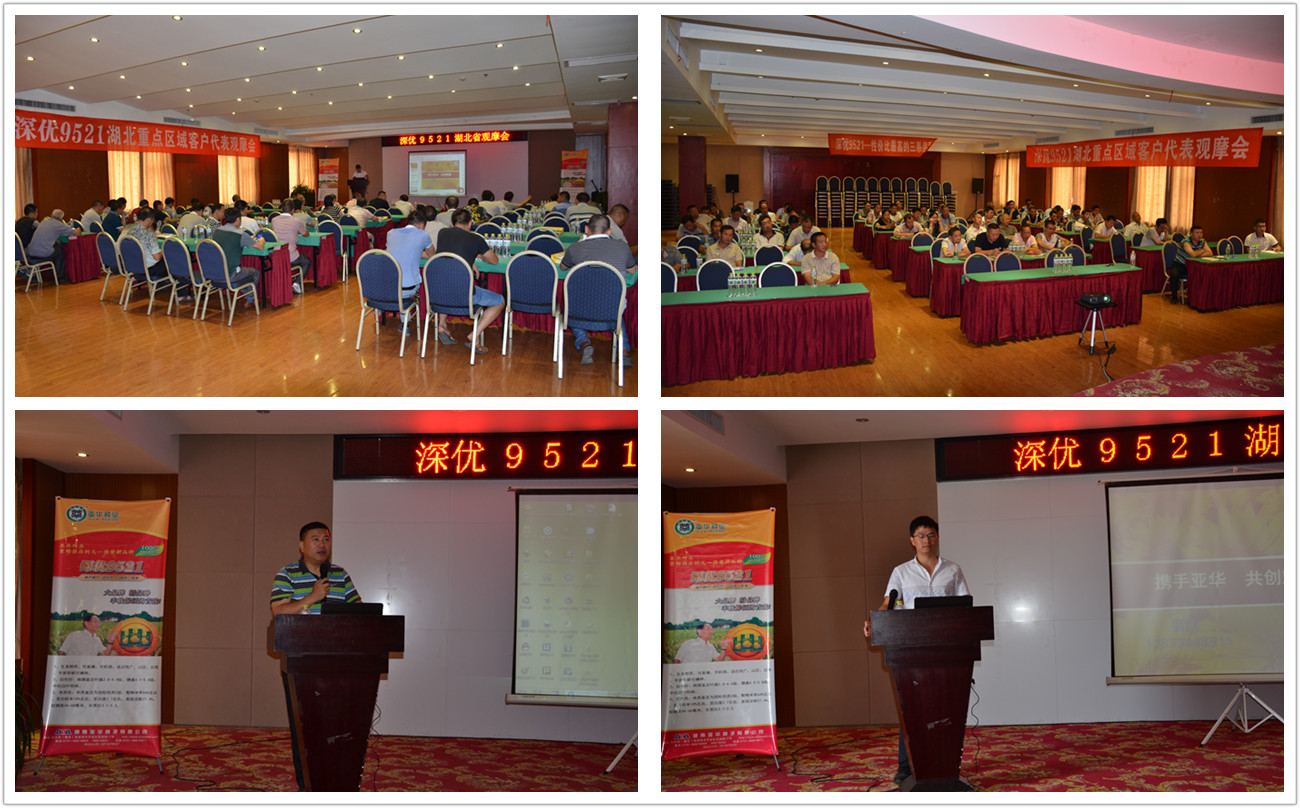 會議上,首先由客戶代表講解深優(yōu)9521的大田表現(xiàn):“深優(yōu)9521的分蘗比較好,畝有效穗多;抗倒強直播、機插、移栽都適合;抗性也不錯,田間沒有稻瘟病發(fā)生。”天門的吳總說到:“深優(yōu)9521容易種,又好管理,產(chǎn)量穩(wěn)定,特別適合種田大戶種植”。隨后,亞華種業(yè)區(qū)域經(jīng)理黃凱對公司做了簡介,還介紹了深優(yōu)9521品種的高產(chǎn)穩(wěn)產(chǎn)、分蘗強、米質優(yōu)、抗倒強、多樣種植模式等優(yōu)勢,并展示了公司的一些后續(xù)優(yōu)勢新品種。最后,湖北分公司總經(jīng)理姜文嘉發(fā)表了深優(yōu)9521的市場運營模式和種業(yè)現(xiàn)狀,提醒大家把握機遇,抓住商機做一個優(yōu)秀的種業(yè)人。
