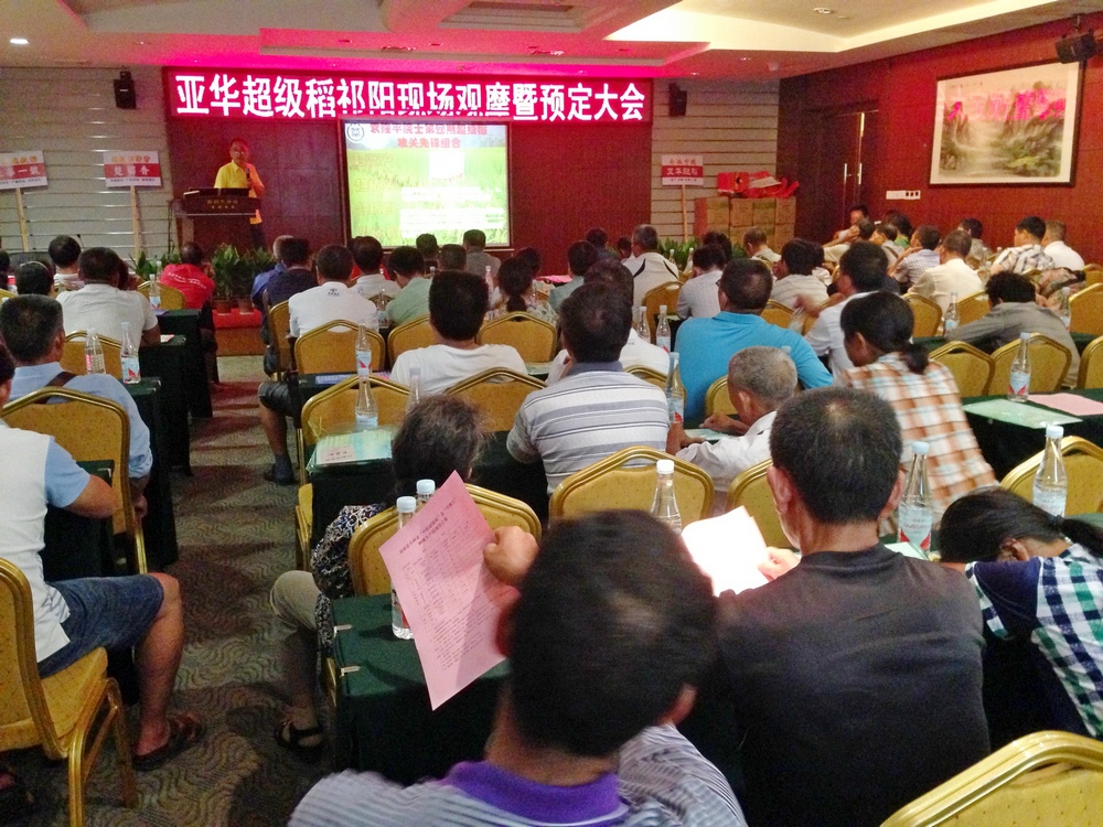 現(xiàn)場(chǎng)觀摩后大家來祁陽四星級(jí)酒店-鑫利大酒店會(huì)議,進(jìn)行室內(nèi)會(huì)議交流和種子現(xiàn)場(chǎng)預(yù)定。預(yù)定大戶由湖南亞華種子有限公司占茂清經(jīng)理主持,會(huì)上亞華種業(yè)首席栽培專家王小清向參會(huì)人員介紹超級(jí)稻深兩優(yōu)5814的特征特性、全國各地表現(xiàn)和栽培技術(shù)要點(diǎn),讓大戶朋友熟悉品種掌握技術(shù)。最后大會(huì)開展預(yù)定工作,經(jīng)銷商朋友積極交款預(yù)定明年銷售品種,大戶朋友更是報(bào)上計(jì)劃,踴躍交款預(yù)定,現(xiàn)場(chǎng)預(yù)定種子達(dá)11000斤。