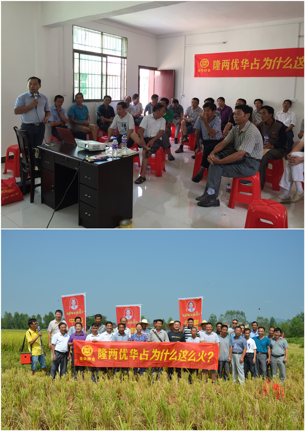 觀摩結束之后開始了室內會議。會議上,江西分公司總經理谷恩華就隆兩優(yōu)華占近兩年在江西各地搶眼表現(xiàn)以及年度運作思路和預定政策進行了講解,渣津鎮(zhèn)和石坳鎮(zhèn)農技站站長講話總結了隆兩優(yōu)華占的特性:分蘗力強、抗倒性好、抗病能力強、米質好、著粒密度密、結實率高等。兩位站長講的激情澎湃,農戶們聽的也是有滋有味。作為在農技站工作了多年的元老,盧站長對水稻品種的鑒定有著豐富的經驗,會議中他激動地說到:“一個品種想要產量好、抗病性好、抗倒性好、米質也好是非常難的,但恰恰隆兩優(yōu)華占就是這樣的好品種,這樣的好品種我們一定要強烈推薦給老百姓種!”