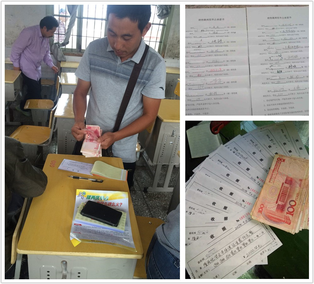 現(xiàn)場觀摩后進行了室內(nèi)會議,會上由湖南亞華種子有限公司肖雙來經(jīng)理給大家做了關于隆兩優(yōu)華占的特征特性、國內(nèi)種植情況、種子供應情況、預定銷售模式及保證金市場管理方法等的詳細講解。隨后,由姚元龍給大家做了相關銷售與政策的講解,經(jīng)銷商們對公司的銷售模式和市場管理方式表示完全贊同,大家都主動繳納了市場維護保證金,之后提交了隆兩優(yōu)華占的預定數(shù)量——現(xiàn)場預定共3200公斤,預計總預定量將達到6000公斤。