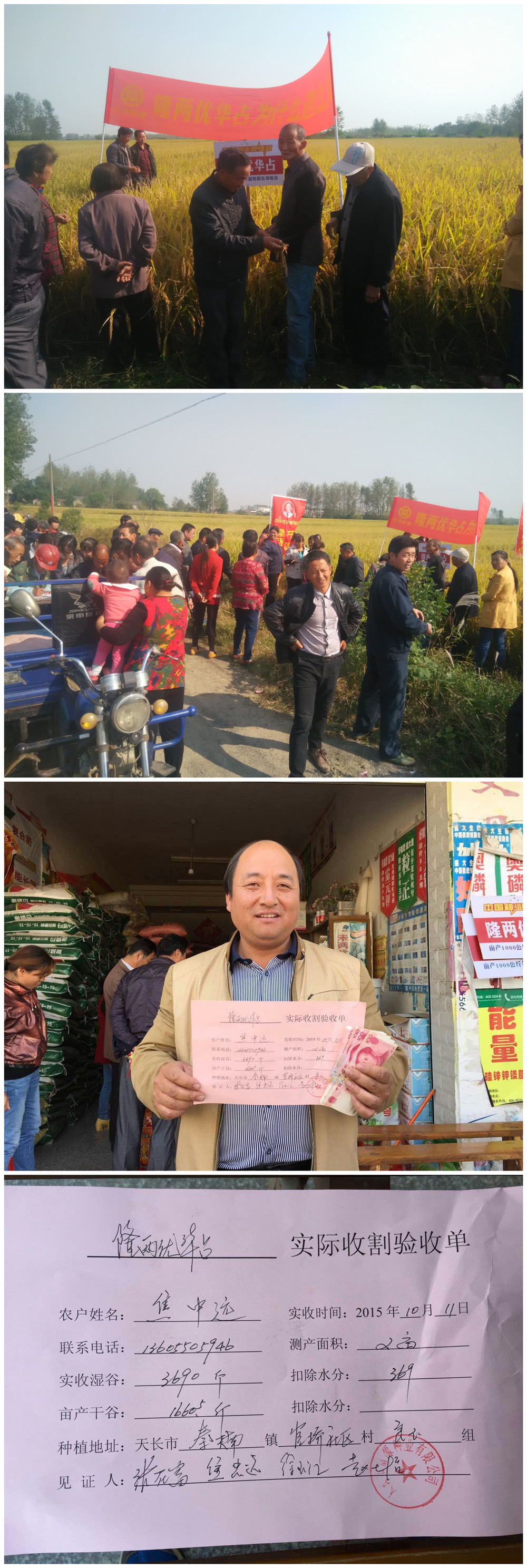 經(jīng)過(guò)半個(gè)小時(shí)的收割,這片2畝的田塊,實(shí)收稻谷3690斤,出去水分折合干谷1660.5斤。種植戶焦中遠(yuǎn)喜上眉梢,,本以為能收到1400斤,實(shí)際干谷收了1660.5斤!沒有想到隆兩優(yōu)華占竟有這樣高的產(chǎn)量。來(lái)參觀的零售商們特別稱贊麥茬田能有這樣高的產(chǎn)量在整個(gè)天長(zhǎng)都不多,非常認(rèn)可隆兩優(yōu)華占的穩(wěn)產(chǎn)高產(chǎn)特性,稱贊隆兩優(yōu)華占分蘗能力強(qiáng),無(wú)病蟲害,抗倒伏能力強(qiáng),結(jié)實(shí)率高。是災(zāi)年穩(wěn)產(chǎn),豐年高產(chǎn)的超級(jí)好品種!