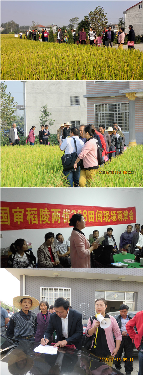 2015年10月18日,湖南澧縣金秋農(nóng)資在素有“澧陽(yáng)平原糧倉(cāng)”之稱的涔南鄉(xiāng)舉辦了由40多位經(jīng)銷商和種植大戶參加的國(guó)審稻陵兩優(yōu)268田間現(xiàn)場(chǎng)觀摩會(huì)。大家參觀了該鄉(xiāng)文家村7組王本生種植的10多畝示范田,老王現(xiàn)場(chǎng)介紹他的栽培要點(diǎn):每畝播種5.5斤,肥水適當(dāng)管理(畝用肥50斤多元素碳銨、20斤鉀肥、追16斤復(fù)合肥),今年預(yù)計(jì)畝產(chǎn)達(dá)1300多斤。他已種植陵兩優(yōu)268四年,年年高產(chǎn),稱得上是晚稻打撒(撒播或稱直播)的首選。當(dāng)大家看到田間金黃色的陵兩優(yōu)268稻穗時(shí),它的株桿挺拔、穗大粒壯、葉青籽黃,引得農(nóng)戶朋友不住稱贊,并情不自禁地拍照留影。原先沒(méi)種植過(guò)陵兩優(yōu)268的農(nóng)戶紛紛表示明年一定要大力推廣種植!