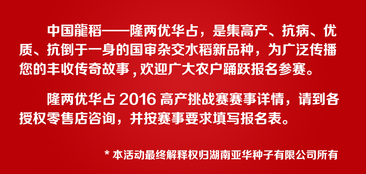 隆兩優(yōu)華占2016高產(chǎn)挑戰(zhàn)賽報(bào)名開(kāi)始啦!