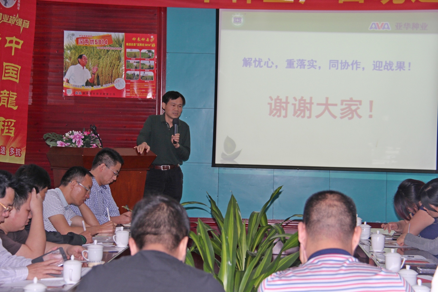 2016年早稻銷售剛一結(jié)束,亞華種業(yè)廣西分公司就擂響了晚稻銷售的戰(zhàn)鼓!4月24日,桂南晚稻區(qū)的30多位代理商悉數(shù)齊聚綠城南寧,參加廣西亞華種業(yè)2016年度桂南晚稻市場(chǎng)啟動(dòng)會(huì),總結(jié)成績(jī)、分析市場(chǎng),共商共謀“深兩優(yōu)5814”新年度的運(yùn)作之道!