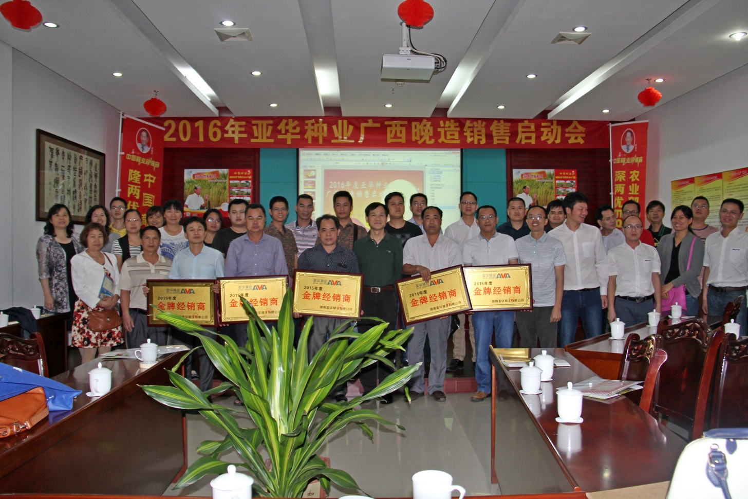 會(huì)議在歡快的樂(lè)曲聲中拉開(kāi)了帷幕。大會(huì)首先表彰了6位2015年度為“深兩優(yōu)5814”推廣佳績(jī)立下汗馬功勞的經(jīng)銷商。授予其亞華“金牌經(jīng)銷商”榮譽(yù)稱號(hào)。其中有5年來(lái)矢志不移以“深兩優(yōu)5814”為核心并在推廣上做出突出貢獻(xiàn)的玉林市金特優(yōu)種子經(jīng)營(yíng)部;有在博白市場(chǎng)憑借“深兩優(yōu)5814”一個(gè)品種之力壓制競(jìng)爭(zhēng)對(duì)手一個(gè)品系的闕總;以及在2015年的市場(chǎng)困境中克難攻堅(jiān),實(shí)現(xiàn)“深兩優(yōu)5814”逆勢(shì)大幅度增長(zhǎng)的靈山縣蘇總、武鳴縣黃總、蒼梧縣李總、八步區(qū)龍總。
