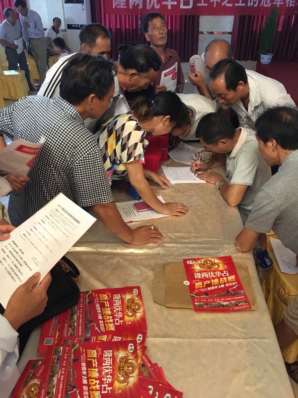 本次會(huì)議由當(dāng)代零售商王經(jīng)理主持。會(huì)議上,首先由代理商、農(nóng)藝師龍飛向在座農(nóng)民朋友講解了隆兩優(yōu)華占“超抗病、超高產(chǎn)、超抗倒、超優(yōu)質(zhì)”的四大優(yōu)勢(shì),并且播放PPT與大家分享了隆兩優(yōu)華占在全國(guó)各地的優(yōu)秀表現(xiàn)與審定情況,同時(shí)現(xiàn)場(chǎng)展示了隆兩優(yōu)華占植株抽穗后的良好長(zhǎng)勢(shì)。 接下來(lái),由姜總向大家講解了今年隆兩優(yōu)華占的預(yù)定政策與優(yōu)惠政策,并表達(dá)了自己的美好希冀。然后,主持人王經(jīng)理又著重強(qiáng)調(diào)了隆兩優(yōu)華占的四大優(yōu)勢(shì)特點(diǎn),并組織了有獎(jiǎng)問(wèn)答,農(nóng)民熱情高漲,踴躍參與。借著高漲的氛圍,預(yù)訂的場(chǎng)面隨之拉開(kāi)了帷幕。