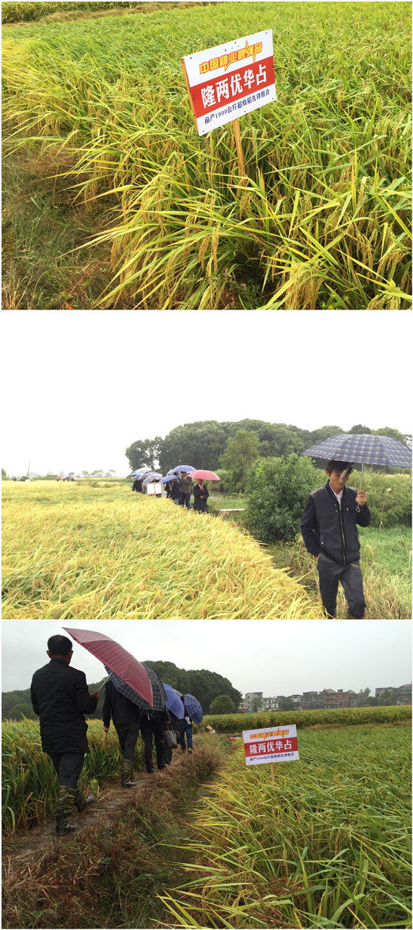 2016年9月28日,今年第17號臺風“鲇魚”從福建沿海強勢登入,當天下午江西大部分地區(qū)受到臺風影響并出現(xiàn)三級以上大風和暴雨天氣。次日,隆兩優(yōu)華占觀摩會在都昌如期舉行,盡管風雨未減,但為了觀看前方的龍稻,便只顧風雨兼程。上午十點鐘,百余號人浩浩蕩蕩的走進了土塘鎮(zhèn)汪家村,大家排起了大長龍來到了隆兩優(yōu)華占示范田邊細細察看。“鲇魚”來勢洶洶,隆兩優(yōu)華占泰然相迎。受臺風天氣影響,道路邊兩邊均有幾塊其他品種田塊出現(xiàn)不同程度的倒伏,唯有隆兩優(yōu)華占紋絲不動,泰然自若。代理商徐總向大家介紹到:“隆兩優(yōu)華占是個多穗型品種,分蘗能力強,在今年極端高溫條件下,在其他品種結實率低下的情況下,隆兩優(yōu)華占仍能保持好的結實率,這幾塊田的產(chǎn)量應該都在1500斤以上。”在和大家溝通中,段師傅和我們分享到:“今年我種了200多畝田,還好種了一半的隆兩優(yōu)華占,要不然就虧本了。隆兩優(yōu)華占我連續(xù)種植了2年,這個品種產(chǎn)量好,也種的穩(wěn),它主要抗性好,抗稻瘟病很好”!