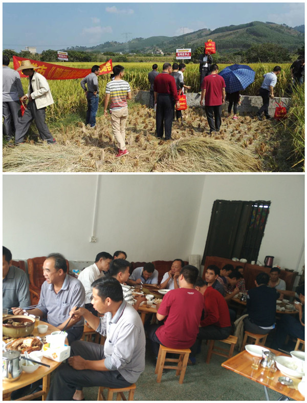 早上八點,全體人員集結(jié)完畢,6部汽車帶著我們向石羅前進。汽車在美麗的鄉(xiāng)間公路前行,一路的風(fēng)景美如畫,經(jīng)過一個小時的行程,我們到達了此次田間的會場。我們向著隆兩優(yōu)華占田塊前行,零售商們紛紛走進田間,仔細地觀察隆兩優(yōu)華占田間的表現(xiàn),有的拉著稻穗,看稻穗的長度并數(shù)粒數(shù),有的扒開稻株觀察病蟲害情況,有的忙著與稻谷合影,有的在田間來回走動,拿隆兩優(yōu)華占與旁邊的其他品種做對比。今年晚稻整個廣西雨季偏多,很多品種得病很嚴(yán)重,特別是稻曲病最為嚴(yán)重,但隆兩優(yōu)華占這邊表現(xiàn)干干凈凈,比旁邊的其他品種表現(xiàn)好很多。大家都稱贊這個品種抗性真的很好。有位零售商跟我說:這個隆兩優(yōu)華占相對其他品種,最大的優(yōu)勢是豐產(chǎn)性和抗性,我做了三年示范了,年年表現(xiàn)很好。在田間會場,貴港代理商簡單介紹隆兩優(yōu)華品種特性,以及他經(jīng)過這三年的跟蹤觀察的感受和了解,他認為如果目前市場上大力推廣的晶兩優(yōu)和隆兩優(yōu)系列是桂楠晚稻的明星品種,那么隆兩優(yōu)華占就是這兩個系列品種里最耀眼的明星。
