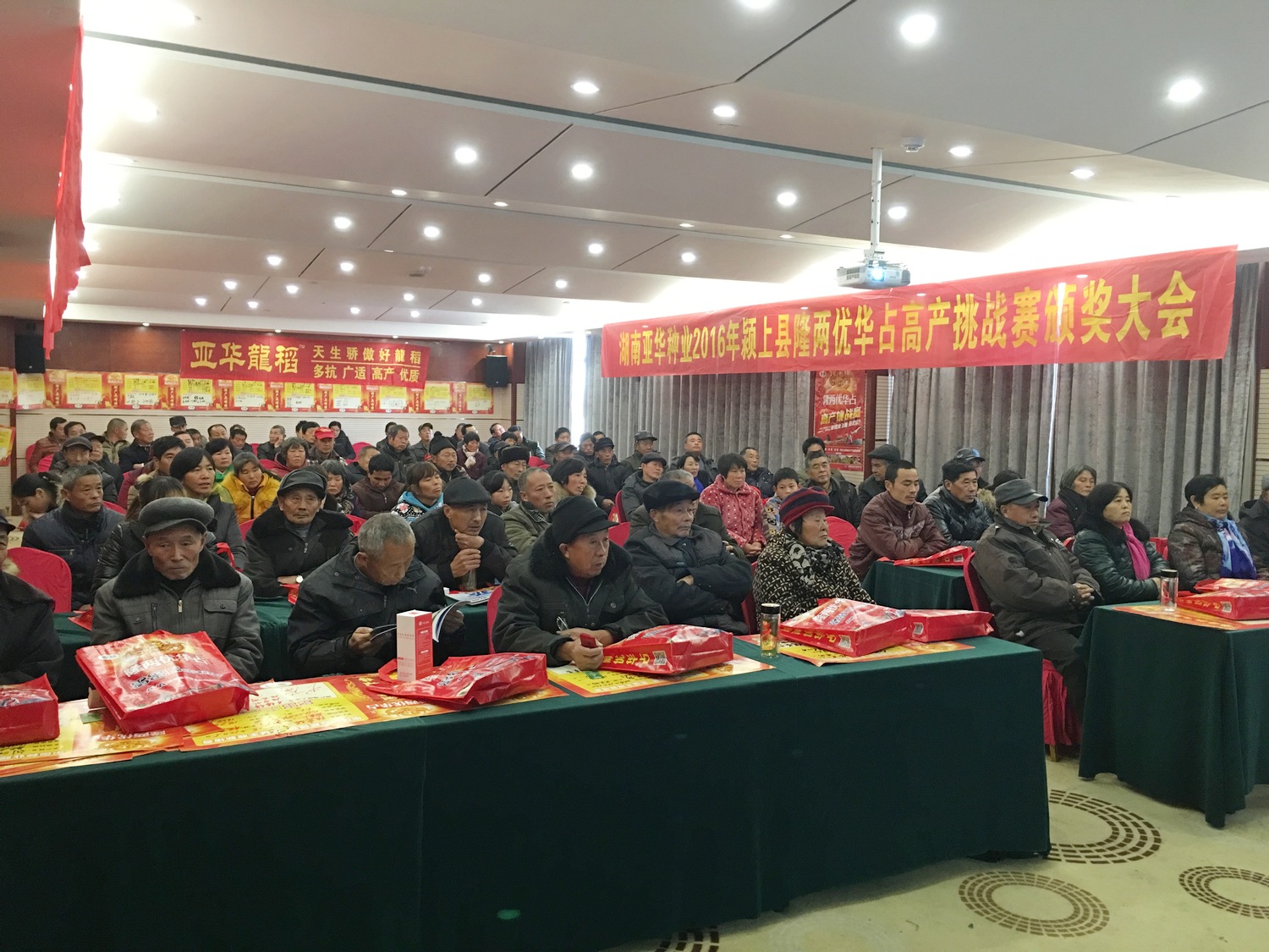 在隆兩優(yōu)華占高產(chǎn)農(nóng)戶還沉靜在豐收帶來的喜悅之際,2016年12月10日,潁上縣田立山總經(jīng)理組織當?shù)亓闶凵毯透弋a(chǎn)農(nóng)戶代表110多人,在潁上縣徽泰國際大酒店高規(guī)格、高格調(diào)召開了湖南亞華種業(yè)潁上縣隆兩優(yōu)華占高產(chǎn)挑戰(zhàn)賽一等獎、二等獎的頒獎大會。在一百多人的共同見證下達到了高效果的反響。