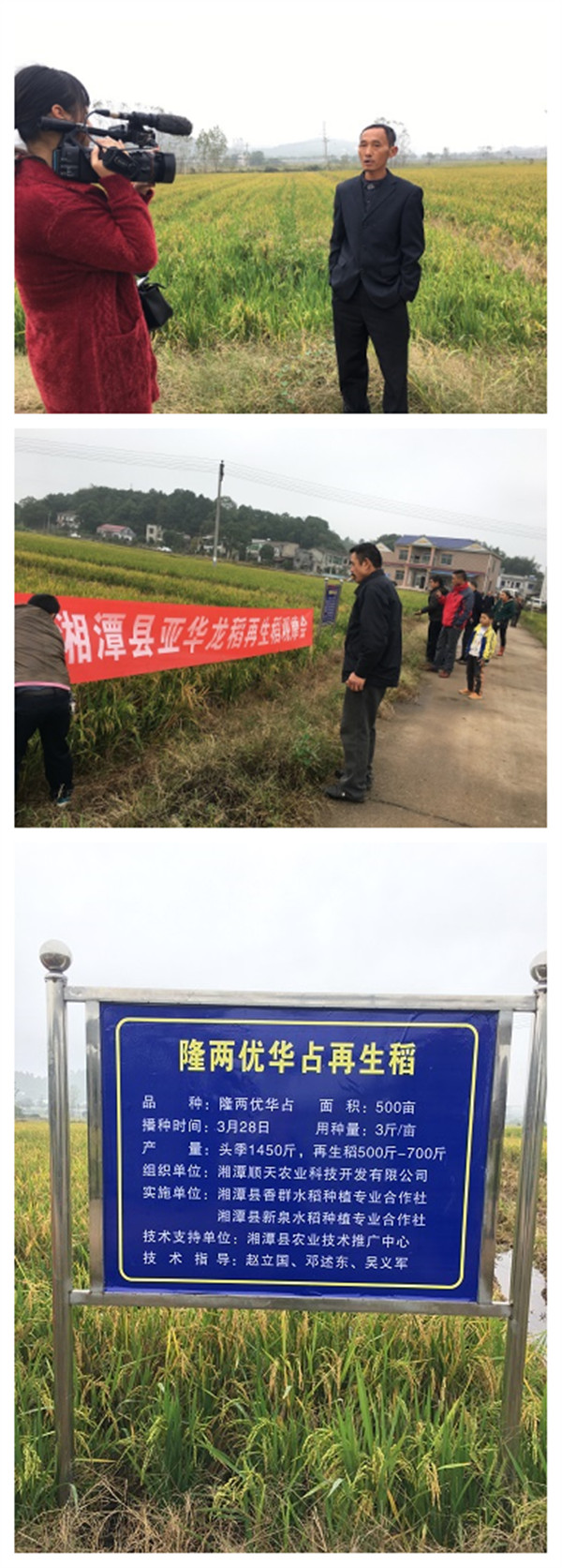 2016年10月30日,在湘潭順天農(nóng)業(yè)科技開發(fā)公司的精心組織下,來自全縣近70名種田大戶與各鄉(xiāng)鎮(zhèn)農(nóng)技推廣員來到湘潭縣中路鋪鎮(zhèn),一起參觀由當(dāng)?shù)叵闳核緦I(yè)種植合作社和新泉水稻專業(yè)種植合作社種植的近千畝再生稻種植片,湖南衛(wèi)視對(duì)此做了報(bào)道。