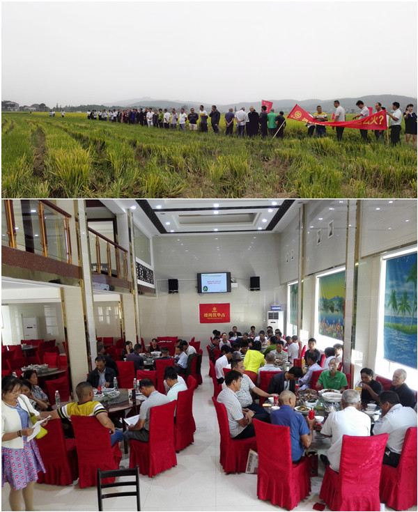 一到田間地頭,代表們就細(xì)看稻田中隆兩優(yōu)華占的結(jié)實率跟穗形。大田中隆兩優(yōu)華占整體上表現(xiàn)出結(jié)實率高、成熟后落色好、抗病能力強、株型緊湊等特點。田間觀摩期間,當(dāng)?shù)胤N植戶現(xiàn)場分享隆兩優(yōu)華占種植經(jīng)驗,從施肥、播種時期、用種量、田間直播除草、多硝唑控高等方面進行講解。看到田間隆兩優(yōu)華占的表現(xiàn),大家紛紛估測產(chǎn)量。田間講解的種植戶李德仁也如實地將2016年月31日觀摩的隆兩優(yōu)華占實收產(chǎn)量進行公布:高產(chǎn)的畝產(chǎn)達1892斤濕谷,平均畝產(chǎn)在1720斤濕谷。這樣的產(chǎn)量讓參會的代表們有些懷疑,因為他們覺得今年的氣候能夠達到這么高的產(chǎn)量可能性不大。但真實的產(chǎn)量及隆兩優(yōu)華占田間表現(xiàn)又打消了他們的疑慮,連連稱贊這的確是個好品種,代表們紛紛與隆兩優(yōu)華占合影留念!