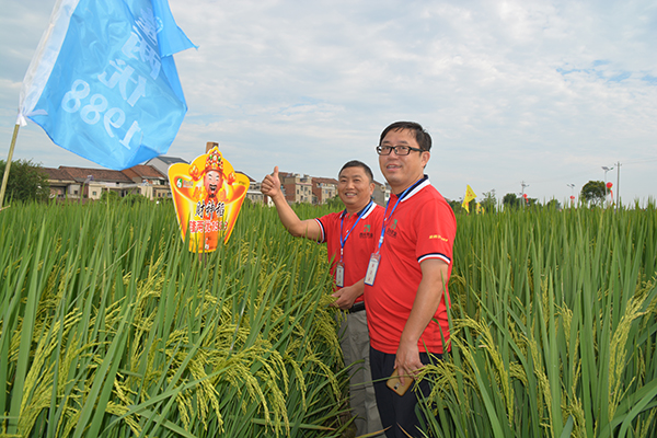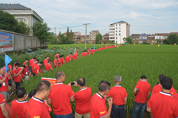 8月19日早上7點(diǎn),一行150多人乘車前往常德鼎城區(qū)周家店示范片進(jìn)行田間觀摩,觀摩分為兩個(gè)片區(qū),一個(gè)為移栽區(qū),一個(gè)為直播區(qū)。播種和移栽時(shí)間均為4月29日和5月30日,移栽田剛齊穗不久,直播田正由乳熟期轉(zhuǎn)為蠟熟期。經(jīng)過觀摩,財(cái)神稻隆兩優(yōu)1988所表現(xiàn)出來的品種優(yōu)勢非常明顯,參與觀摩的經(jīng)銷商及農(nóng)戶無不拍手稱贊。直播田所表現(xiàn)出來的超高抗高溫結(jié)實(shí)率、超多畝有效穗,平均每畝28萬穗等;移栽田表現(xiàn)出的超強(qiáng)分蘗數(shù),穗大粒多,優(yōu)秀的株葉形態(tài)等都說明了財(cái)神稻的絕對優(yōu)勢,抗病抗倒,優(yōu)質(zhì)高產(chǎn),絕對是一個(gè)能給農(nóng)戶帶來財(cái)富的水稻好品種,三國審財(cái)神稻實(shí)至名歸!