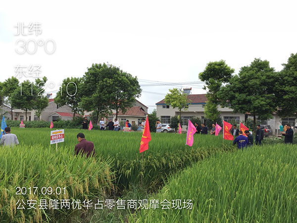 2017年9月1日上午,來自公安縣各鄉(xiāng)鎮(zhèn)的零售商及種植大戶20余人在代理商余總的帶領(lǐng)下,來到位于夾竹園鎮(zhèn)紅星村隆兩優(yōu)華占的田間進(jìn)行現(xiàn)場(chǎng)觀摩。