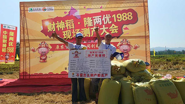 當(dāng)天,重慶各個區(qū)縣的水稻經(jīng)銷商、種糧大戶和村民代表等六七百人,通過到現(xiàn)場觀摩或在酒店觀看電視直播方式,一起見證了隆兩優(yōu)1988水稻在新盛鎮(zhèn)新盛村種植的情況。經(jīng)過對唐洪平種植的1.3畝水稻進行機收測產(chǎn),平均畝產(chǎn)量達1965.27斤,成為梁平最高水稻畝產(chǎn)量,高出村民種植的常規(guī)水稻700斤左右。