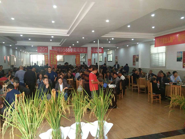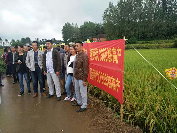 上午8點,來自各個鄉(xiāng)鎮(zhèn)共計308名經(jīng)銷商和農民朋友在棗陽市代理商吳總的組織下乘車前往,浩浩蕩蕩的車隊將參會的300多人載到棗陽市清潭鎮(zhèn)財神稻——隆兩優(yōu)1988的示范田。300多人有序地朝著周光寶師傅家的田塊走去。一到周師傅家的田里,300多人都對今年財神稻隆兩優(yōu)1988的結實率所折服,紛紛豎起了大拇指。還有很多人猜測,至少有1800斤/畝。大家都到齊后,胡經(jīng)理給大家介紹了財神稻隆兩優(yōu)1988的品種特性,接下來周光寶師傅對自己的田塊如何種植做了簡短地介紹,從他的言語中表露出對今年財神稻隆的表現(xiàn)非常滿意。