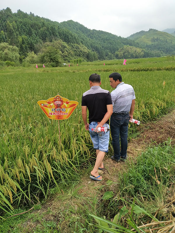 示范戶種植了2畝隆兩優(yōu)1988,長勢喜人,穗大粒多,劍葉挺拔,一派繁榮豐收的景象,在場的零售商無不豎起大拇指,紛紛贊揚財神稻的優(yōu)秀表現,對來年財神稻的銷售充滿信心,大家高興地說到:“如果邵武各地都種滿財神稻,那么“糧倉”的美譽將會更加名副其實!