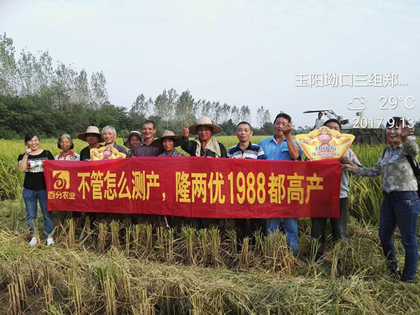 2017年9月13日上午,在當(dāng)陽廟前鎮(zhèn)煙集村和廟前鎮(zhèn)解放村分別在隆兩優(yōu)1988代理商朱錦華和財(cái)神稻推廣零售商王敏的組織下,迎來了現(xiàn)場來參觀的50個(gè)種植戶代表,一起見證財(cái)神稻的高產(chǎn)量表現(xiàn)。