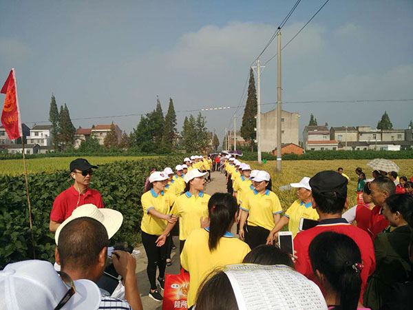 會場的氣氛好不火爆,荊州電視臺至此進行全程的跟蹤報道,雙機位加航拍的豪華配置,好像在擔心會錯過任一細節(jié)。看!田邊突然出現(xiàn)一道金黃靚麗的風景線,走近一看,原來是云集的跳舞大媽前來以舞慶祝!這,就是隆兩優(yōu)華占的測產(chǎn)觀摩會!