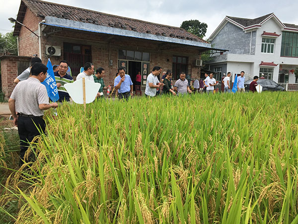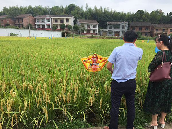 上午9點(diǎn)半左右,與會(huì)所有人員集合完畢,一行20余人驅(qū)車前往位于醴陵茶山鎮(zhèn)的隆兩優(yōu)1988種植田塊觀摩,定要讓大家眼見(jiàn)為實(shí)!10點(diǎn)多到達(dá)觀摩點(diǎn),雖然烈日當(dāng)頭,但還是擋不住零售商們的觀摩熱情,據(jù)該田塊的種植農(nóng)戶反應(yīng),5月中下旬撒播,肥力水平一般,基本屬于粗放狀態(tài)。吳總說(shuō),這個(gè)觀摩田也是臨時(shí)找的,前面定的田塊農(nóng)戶沒(méi)通知就收割了。來(lái)到示范田給零售商們的第一感覺(jué)就是:滿田都是谷子??!再看看邊上幾塊田,要么葉瘟嚴(yán)重,要么有效穗不足、結(jié)實(shí)率低、空癟粒多,和財(cái)神稻根本不能比??剐詮?qiáng)、高產(chǎn)穩(wěn)產(chǎn)、耐高溫、結(jié)實(shí)率高是財(cái)神稻的主要特點(diǎn)。零售商們紛紛拍照記錄,還有一個(gè)客戶甚至跑到田中間數(shù)有效穗,還隨便抽了幾穗谷子,自己在一旁蹲下來(lái)默默的開(kāi)始數(shù)粒數(shù)了。事實(shí)勝于雄辯,看過(guò)之后無(wú)一不點(diǎn)頭稱贊的,這個(gè)好的品種怎么可能輕易錯(cuò)過(guò)呢!