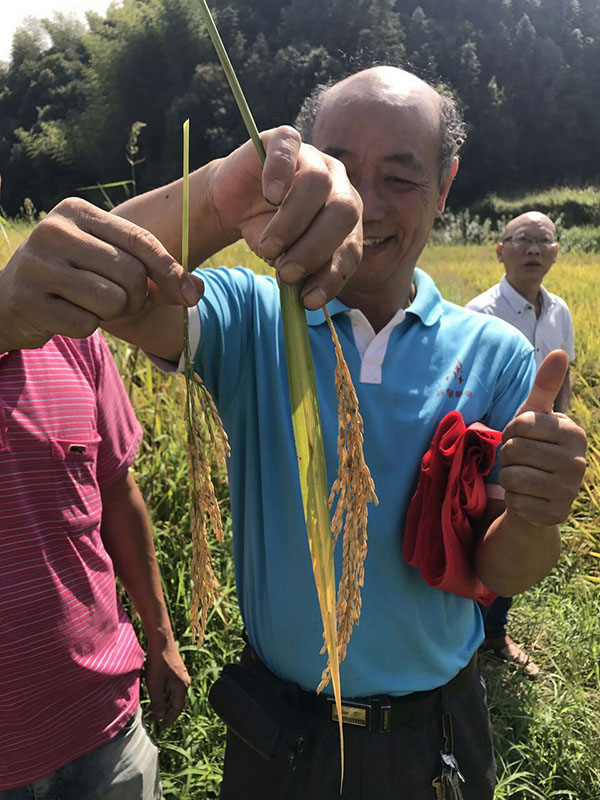 與會(huì)人員來(lái)到觀摩會(huì)現(xiàn)場(chǎng)沿著田埂、彎下身子看著將要收割的隆兩優(yōu)1988水稻,被眼前大大的稻穗、超高結(jié)實(shí)率的景象所深深地打動(dòng),比穗子的比穗子,數(shù)粒數(shù)的數(shù)粒數(shù),紛紛猜測(cè)著這塊田能收割多少斤,都想馬上知道財(cái)神稻到底能有多高的產(chǎn)量,興奮得像是自家的田地一般。示范戶陳有林說(shuō):“我這塊田肥水一般,靠近田埂里邊還會(huì)冒冷水,今年能種植長(zhǎng)勢(shì)如此之好的水稻,靠的是“財(cái)神稻”這樣好品種,來(lái)年我50多畝耕地全部種上隆兩優(yōu)1988”,大家一致贊同,真是喜看稻田千重浪,欣然起舞在其間!